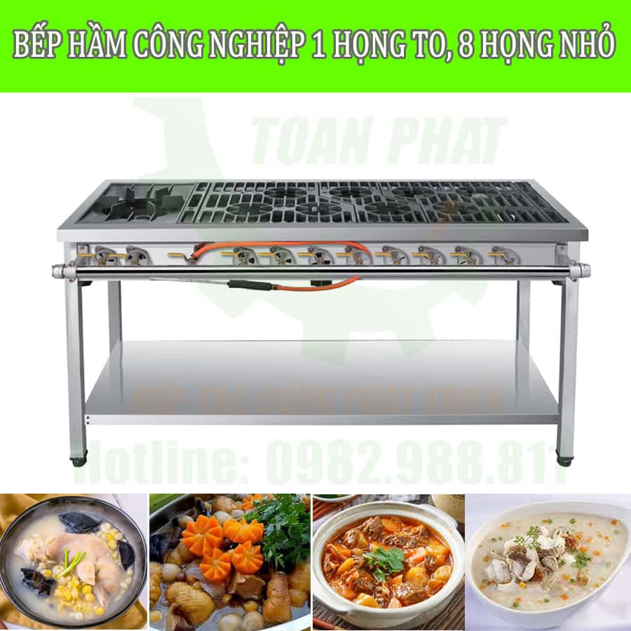Bếp hầm 1 họng đốt to 2 vanh lửa, 8 họng đốt nhỏ 1 vanh lửa là dòng bếp được thiết kế 1 bếp to và 8 bếp nhỏ hoạt động độc lập, đáp ứng được nhu cầu chế biến nhiều món cùng lúc mang lại hiệu quả gấp nhiều lần so với các loại bếp thông thường. Vì vậy đây là dòng bếp không thể thiếu được trong các căn bếp nhà hàng, khách sạn hoặc những nơi có nhu cầu chế biến suất ăn lớn.