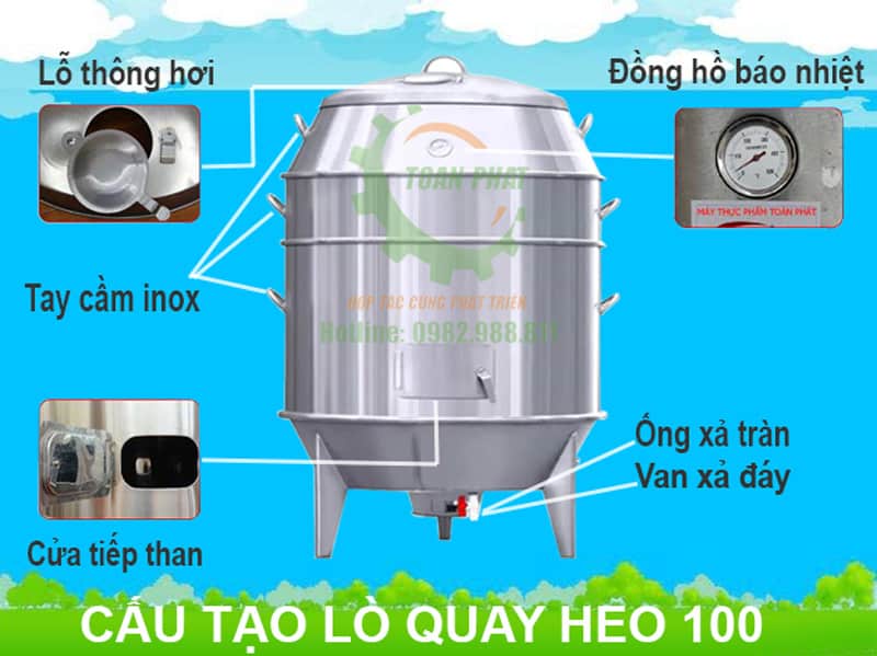 Lò quay heo 100 làm chín thịt nhờ hơi nóng của than giúp cho thực phẩm chín đều từ trong ra ngoài, do vậy thành phẩm khi đạt vẫn giữ được độ ngọt của thịt, lớp da bên ngoài vàng óng đẹp mắt và đặc biệt vẫn giữ nguyên được hương vị của từng loại thực phẩm.