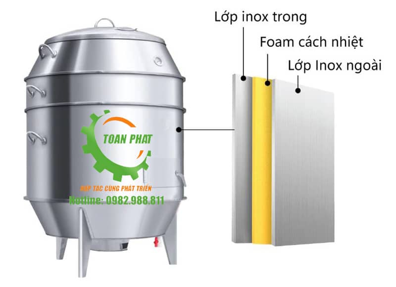 Thân lò thiết kế 3 lớp, lớp trong và ngoài là inox ở giữa là foam cách nhiệt dày giữ nhiệt tốt, lò lên nhiệt nhanh, không bị thất thoát nhiệt ra bên ngoài đảm bảo an toàn cho người sử dụng. Một điểm khác biệt rõ ràng ở lò quay heo 100 khác với các lò thông thường là đã được nâng cao thêm 1 vanh lò, giúp cho không gian treo heo rộng rãi, phần thịt quay gần lò than không bị cháy xém.