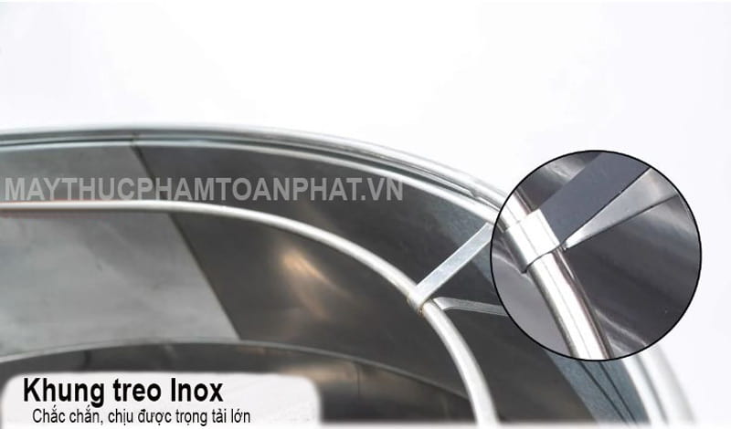 Bên trong thân lò được trang bị các giá treo thực phẩm bằng inox dày dặn chắc chắn, chịu trọng tải cao có thể quay heo, lợn nguyên con hoặc vịt gà 15-17 con/mẻ quay.