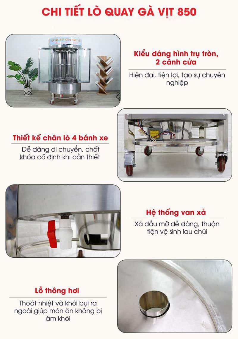 Lò quay vịt 850 sử dụng 2 nguyên liệu than và gas để quay vịt, gà đang ngày càng được nhiều khách hàng ưa chuộng không chỉ sở hữu thiết kế hiện đại, mà sản phẩm còn sở hữu nhiều các tính năng nổi bật.
