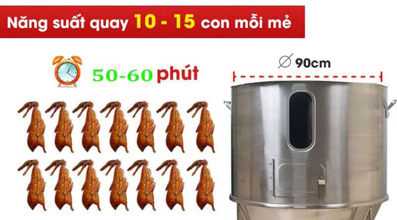Với đường kính 900mm, lu quay vịt inox 1 ô kính phi 90 có thể quay được 10-15 con vịt hoặc gà loại 1.8-2kg/con trong khoảng thời gian từ 50-60 phút.