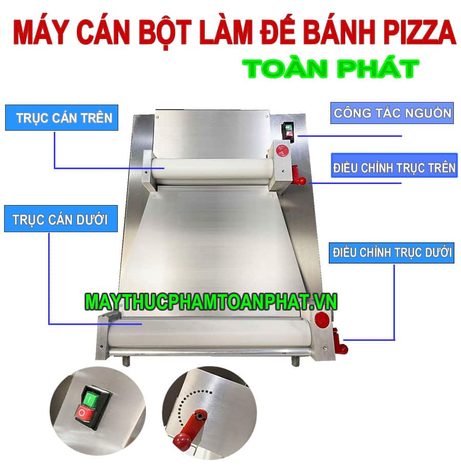 Máy thiết kế 2 lô cán bột làm cho đế bánh mỏng và dễ tạo hình hơn.Độ dày mỏng của đế bánh có thể thay đổi bằng cách điều chỉnh khoảng cách giữa 2 quả lô cán bột. Khoảng cách giữa 2 quả lô cán càng lớn thì đế pizza càng dày và ngược lại. Mỗi lô cán bột có cần điều chỉnh độ dày riêng biệt.