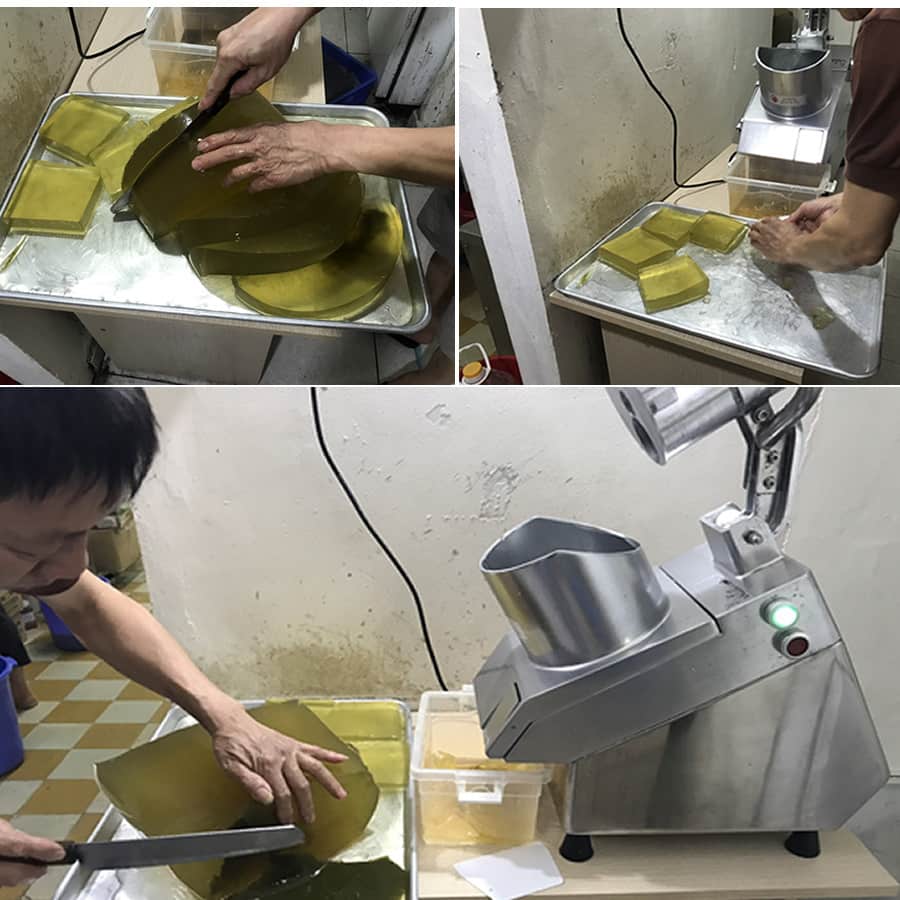 Sử dụng máy cắt thạch thái thạch rút ngắn mọi thao tác của bạn. Việc duy nhất của chỉ là thả thạch nguyên khối vào họng cắt và đợi các lát thạch đã được cắt đều đẹp ra ngoài.