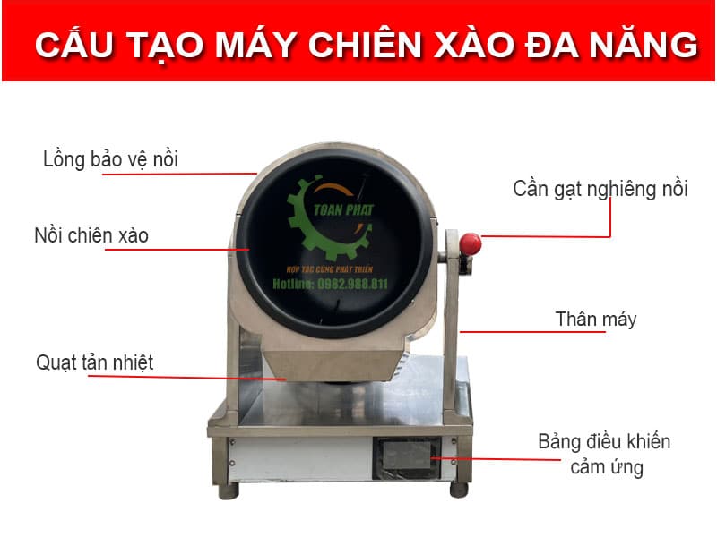 Sản phẩm có cấu tạo khá đơn giản gồm: thân máy, nồi chiên xào, cần gạt nghiêng nồi, quạt tản nhệt, bảng điều khiển cảm ứng.