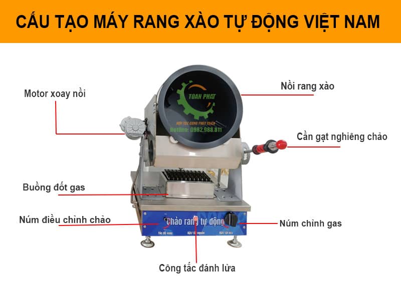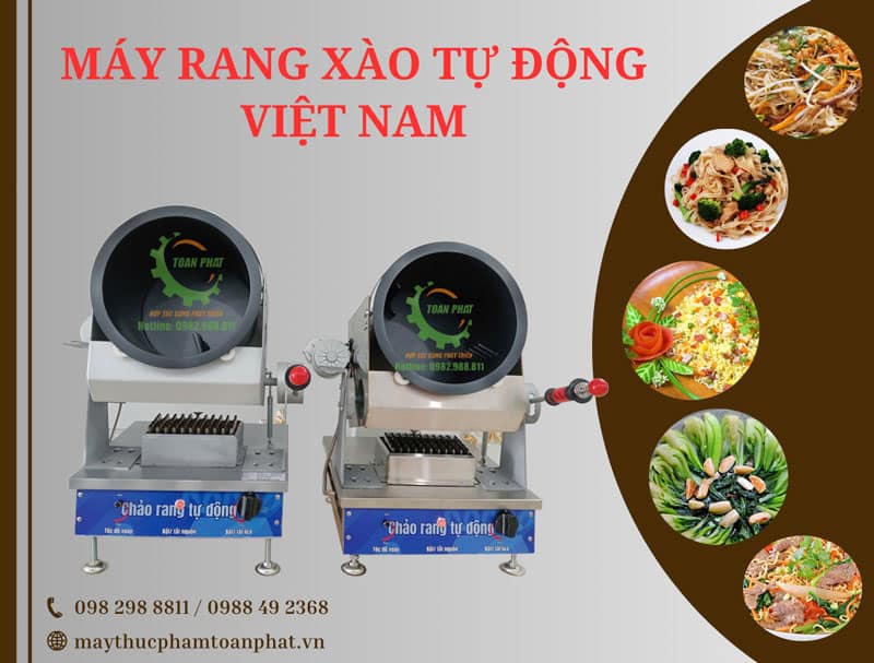 Máy rang xào tự động Việt Nam là dòng máy chuyên dùng để rang cơm, xào rau, xào mì, miến, phở tại các nhà hàng, quán ăn. Thiết bị sử dụng nhiên liệu đốt bằng gas, có khả năng tự động xoay và điều chỉnh nhiệt trên thân thức ăn sẽ được chín đều thơm ngon và nhanh chóng hơn cách chế biến thủ công.