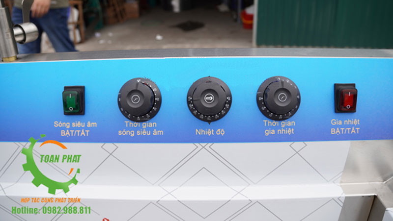 Phía trên bồn rửa là bảng điều khiển với các chế độ Bật/Tắt song siêu âm, núm vặn điều chỉnh thời gian song siêu âm, núm điều chỉnh nhiệt độ, núm điều chỉnh thời gian gia nhiệt và nút Bật/Tắt gia nhiệt tất cả đều được chuẩn hóa bằng tiếng Việt, giúp người dùng dễ dàng sử dụng hơn.