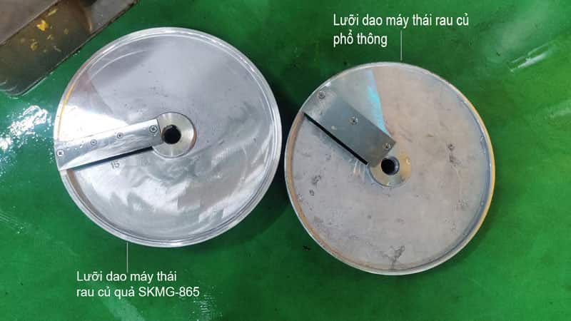 Máy sử dụng các loại lưỡi dao linh hoạt theo nhu cầu như thái lát (2-10mm), thái sợi (2-10mm), thái hạt lựu (6mm, 8mm, 10mm, 12mm, 15mm, 20mm, 25mm, 20x40mm, 25x20mm), mỗi căn bếp sẽ có nhu cầu sử dụng kích thước nguyên liệu khác nhau, nên khi tìm hiểu và mua máy thì khách hàng có thể chọn mua thêm lưỡi dao với kích thước khác nhau, còn bộ lưỡi dao theo máy nhà sản xuất đã trang bị cho chiếc máy SKMG-865 này bộ lưỡi dao phổ thông với kích thước lần lượt như dao thái lát (3mm), dao thái sợi (3mm), dao thái hạt lựu (10mm).
