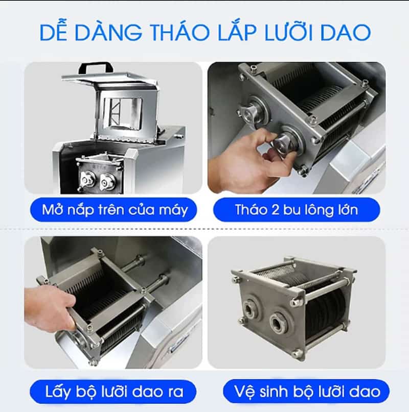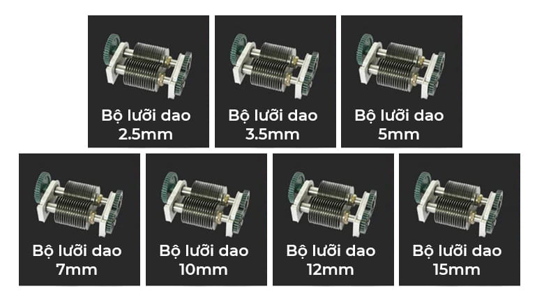 Máy được trang bị tới 7 bộ lưỡi dao được làm từ thép tôi sắc bén với kích thước từ: 2.5mm – 3.5mm – 5 mm- 7 mm- 10mm -12mm – 15mm. Máy có thể tháo lắp thay thế các bộ dao trên nên nếu cần thái đa dạng kích cỡ thịt thì chỉ cần mua thêm bộ dao mà không phải đầu tư chi phí mua máy mới.