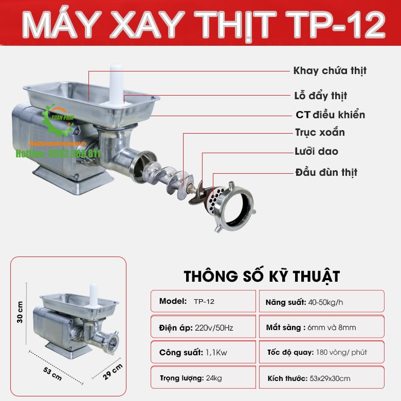 Máy xay đùn thịt TP-12 là một trong những dòng máy xay thịt công nghiệp đem lại năng suất cao cho người dùng, đáp ứng được nhu cầu sản xuất của các quán ăn , nhà hàng hoặc các cơ sở chế biến thịt quy mô vừa và nhỏ.