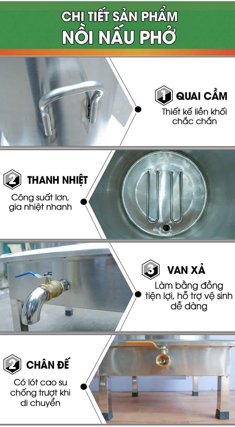 - Nồi nấu phở được làm nóng bằng 2 thanh nhiệt cho tốc độ gia nhiệt cực mạnh.