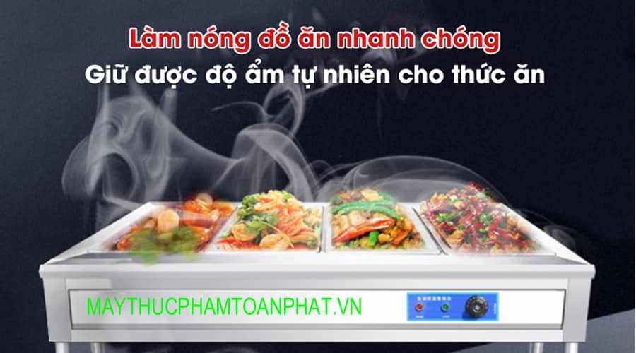 Với cơ chế hoạt động bằng nhiệt lượng sinh ra của thanh nhiệt sẽ đun sôi lớp nước nóng trong tủ, tạo ra hơi nước nóng làm nóng toàn bộ phần đáy khay chứa món ăn. Nhờ vậy thức ăn sẽ luôn được giữ nóng, đảm bảo cảm giác ngon miệng cho thực khách khi thưởng thức.