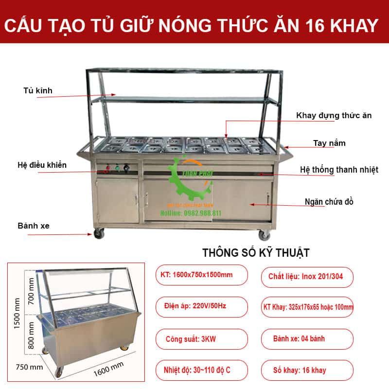 Hơn nữa, tủ giữ nóng thức ăn 16 khay còn được thiết kế thêm khung kính trong suốt (có đèn led chiếu sáng) để ngăn ngừa tối đa bụi bẩn, côn trùng tiếp xúc với đồ ăn và giúp thực khách có thể dễ dàng quan sát các món ăn đang được bày bên trong hơn.