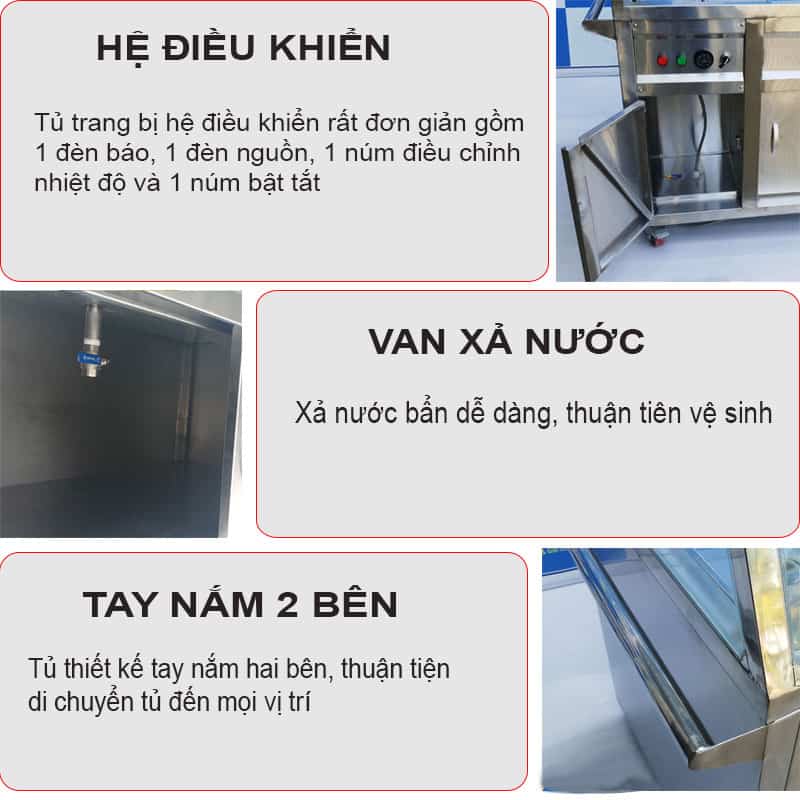 Tủ giữ nóng thức ăn 16 khay thiết kế hệ thống điều khiển khá đơn giản gồm 1 đèn báo , 1 đèn nguồn, 1 núm điều chỉnh nhiệt độ và 1 núm bật tắt nguồn. Thiết bị này trang bị thêm rơ le cảm biến nhiệt tự động ngắt khi nhiệt độ nước đạt đến mức người dùng cài đặt và tự đột hoạt động trở lại khi nhiệt độ nước giảm xuống dưới mức cho phép, Quá trình lại lặp đi lặp lại giúp nhiệt nóng luôn duy trì ổn định và đồng thời tiết kiệm điện hiệu quả dù tủ giữ nóng thức ăn hoạt động cả ngày.